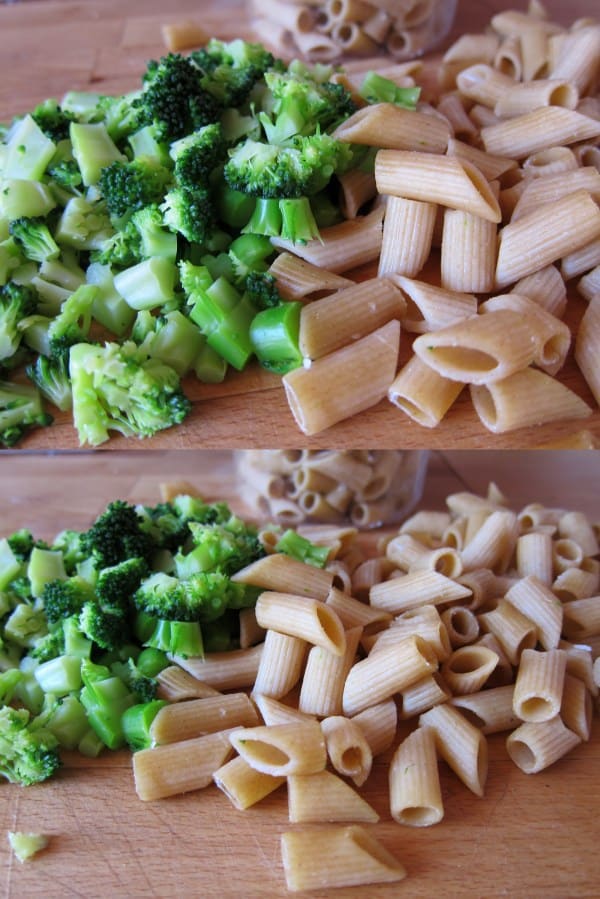 Short pasta noodles such as elbows work best but if you can’t find the right shape in a whole wheat variety, just break them before cooking or cut them afterward. I used whole wheat penne and sliced them after they came out of the water.