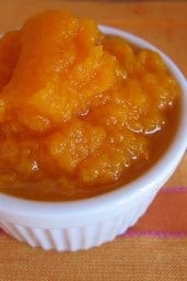 As with most baby food purees, a “recipe” isn’t really in order. It’s more of an idea or technique. For Estelle’s latest batch, we (and when I say “we” I mean my trusty assistant and me) just bought a couple pounds of organic carrots, peeled, chopped and steamed them in a sauce pan with about an inch of water. Later on, I’ll roast them in the oven with olive oil but at seven months she’s still pretty new to solids and if I have to introduce one thing at a time I’ll keep going with fruit and veggies for now.