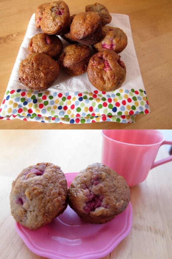 In the meantime, I switched a few things around: no blueberries, organic (frozen) raspberries instead. In went the wheatgerm and if I’d had any thawed, I’d have used applesauce instead of oil which I’ll include as an option here.