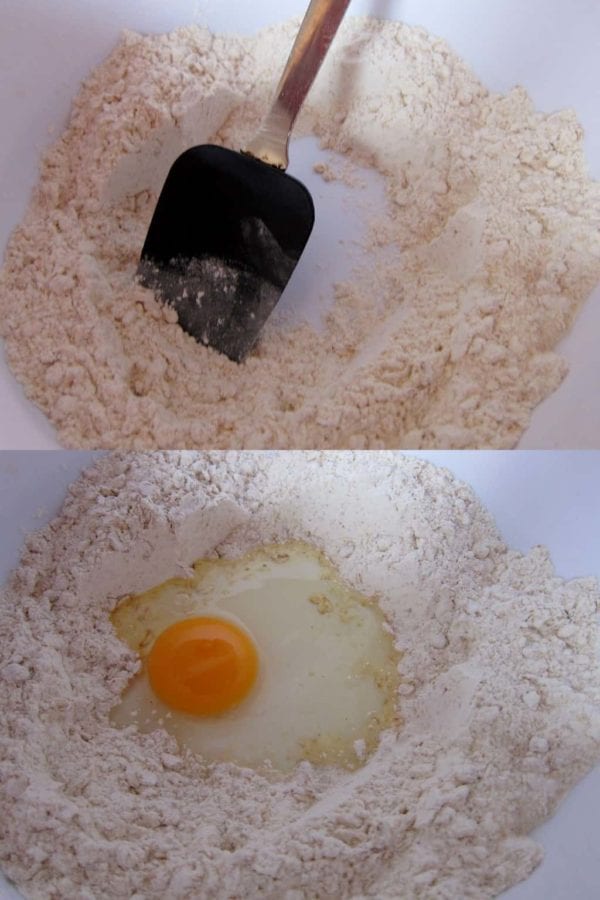 Preheat oven to 400. In a large bowl whisk together flour, wheat germ, oats, baking soda and powder plus salt. Use your fingers to create a well, pushing the dry ingredients to the edges of your bowl until you can see several inches of the bottom of your bowl. If you’ve ever made homemade pasta, this will look familiar. If you haven’t, this technique will save you from washing two bowls.