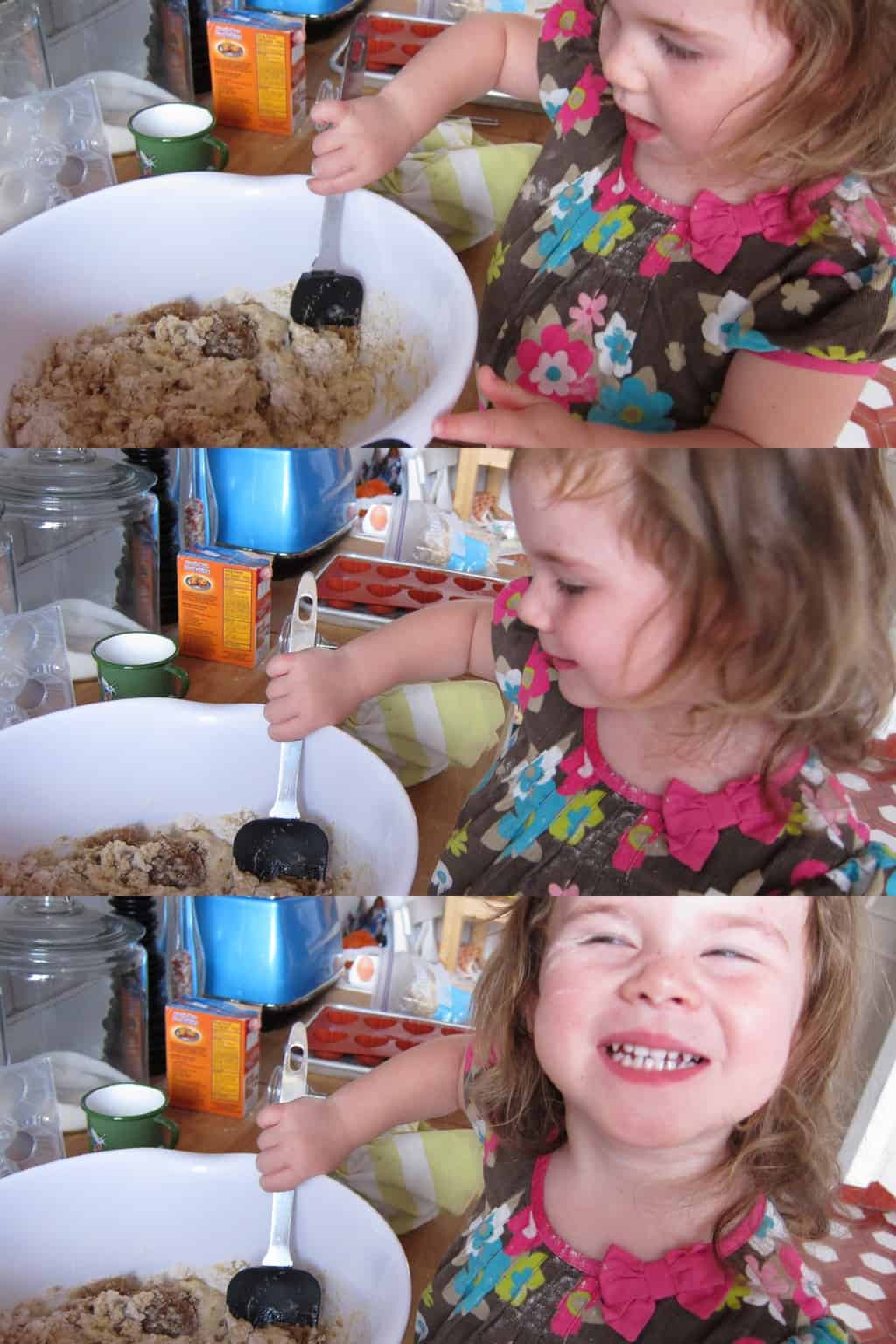 As usual Phoebe was on hand but it’s not always easy to have a renegade toddler in the kitchen. Trying to “help” she’d already filled two of the muffin cups with batter by the time I threw away the egg shell and turned back around. The problem: said cups needed to be oiled first. Out when the batter, hand wash the pan… Let’s start again. Her enthusiasm simply cannot be harnessed. We’re working on the whole “cooking together is a privilege so you need to listen” lesson but after the thousandth time her doughy fingers made their way into the raw batter despite my reminders to the contrary, it seemed my efforts were falling short. Mercifully all the batter was used in one go and, phew, the task was done. This may have been ambitious on a day when I wasn’t feeling my best. Or really any day. But onward we go.
