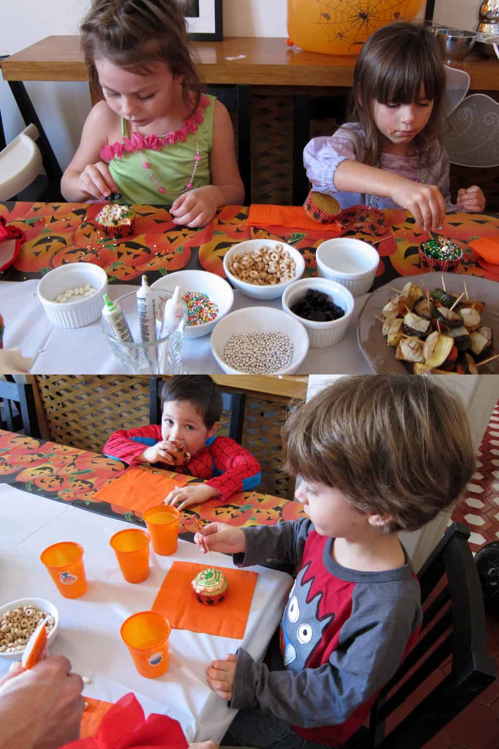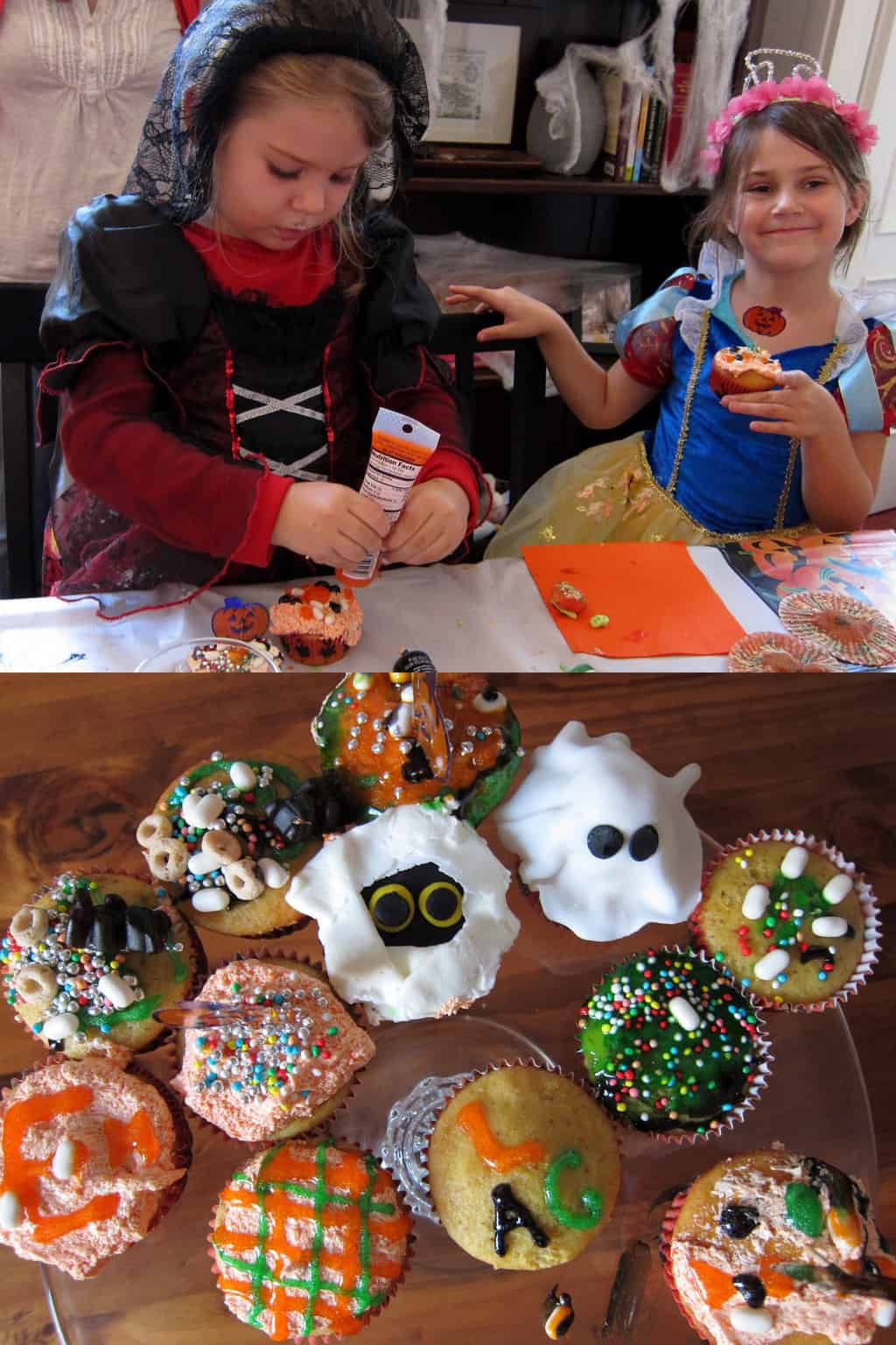 A few kids did more than one but the controversial move, mine again (what is my problem?), came when I suggested the kids create their confections and put them on display until after lunch. As one dad said with a shrug, setting the bar pretty high. And it was. A few partially eaten cupcakes later (calling Phoebe…), lunch was served and the cakes made their official we’re-ready-to-eat appearance. Happy Halloween!