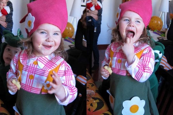 DESPERATE FOR A LITTLE TRICK-OR-TREATING, we hosted our own Halloween party for ex-pats this weekend. The result: 13 kids, 15 adults and countless cupcakes. Costumes for the Mathews crew included one garden gnome (and if you’ve never heard a 2-year old try to say “gnome” I highly recommend it) and one flower. Monster Mash played in the background while kiddies decorated cupcakes and ate mummy pizzas with orange punch. Next came a round of trick-or-treat, the inside version. Using every available bedroom, office or bathroom door, our fairies and superheros made the rounds of our apartment, knocking and squealing until their bags were bursting with candy.
