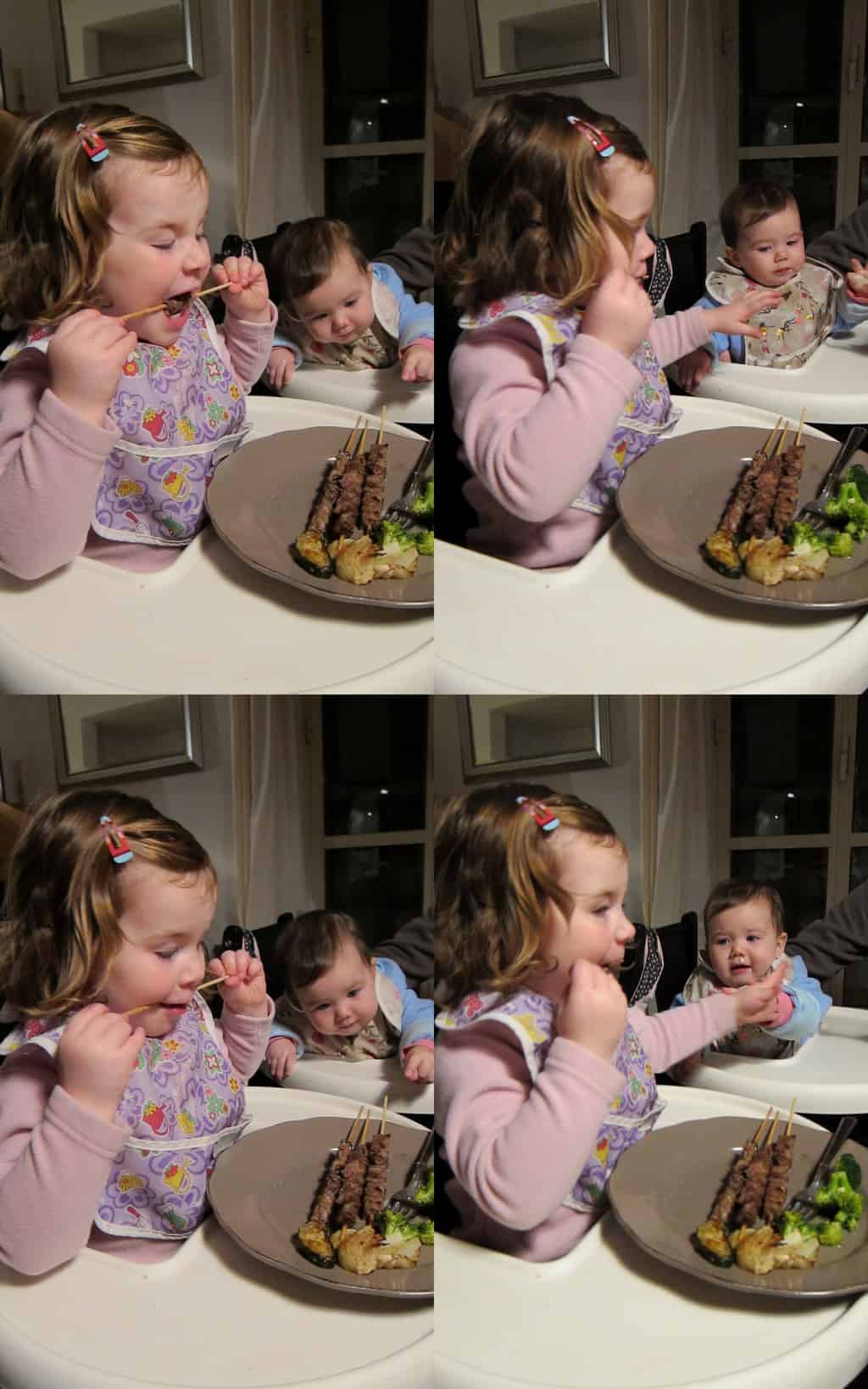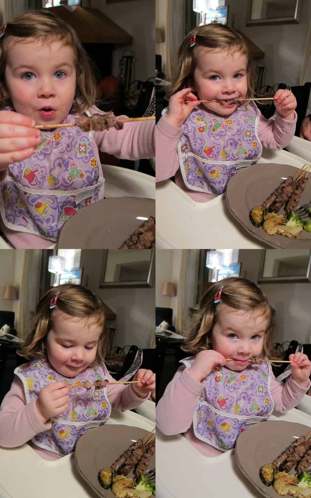 Phoebe loves these sticks so much they work brilliantly to encourage eating veggies too. She likes broccoli but the roasted trio were tough. Before we gave her another stick-o-meat this time, we just asked her to try the roasted vegetables.