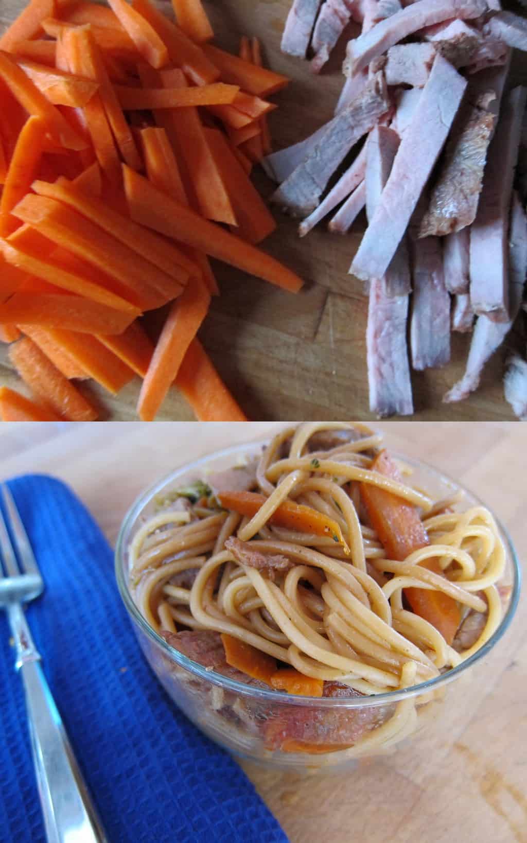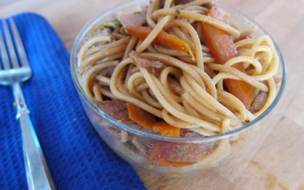 Fill same pan with the carrots and broccoli. Add enough water to halfway cover the veggies and steam over medium heat, with a lid loosely on top, until tender. About 8-10 minutes. Alternatively, add veggies to the pasta water about 5 minutes before it’s done. Drain pasta (and veggies if added), reserving 1 cup pasta water. Combine the meat, veggies, all scrapes of BBQ sauce plus 1/2 cup soy sauce (preferrably light sodium). Toss, add water to loosen as needed and salt and pepper to taste.