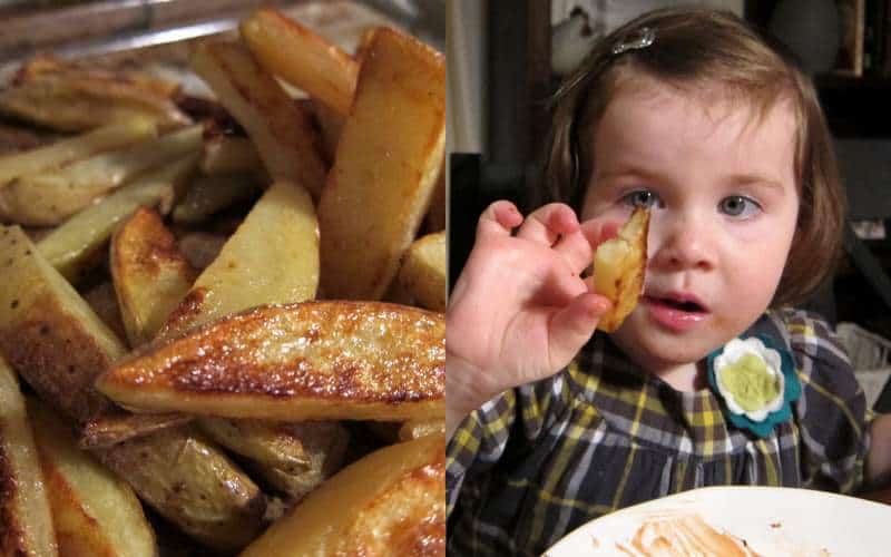 We already know that potatoes have moved from Phoebe’s list of What Doesn’t Work to What Works (see right. And also, yay!) Gwyneth Paltrow’s recipe for no-fry fries included a few more steps than I usually take, intended to increase crispiness and overall flavor. She advises to peel first, then cut potatoes into thin sticks (1/3 inches each). Next, soak them in cold water before roasting in a hot oven at 450. These fries were pretty good but not necessarily crispy. This, however, was actually better for Estelle whose two-teeth technique involves sucking all the soft potato goodness out of their roasted outsides. And either way, the ingredients are simple, healthy fare: fresh potatoes, olive oil and a pinch of salt. Potassium doesn’t get much tastier than this.