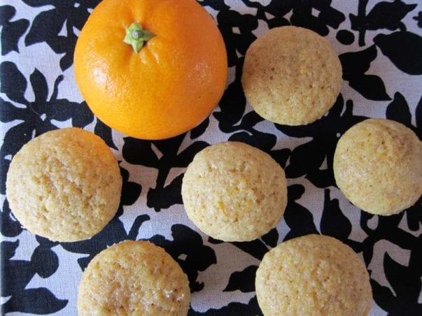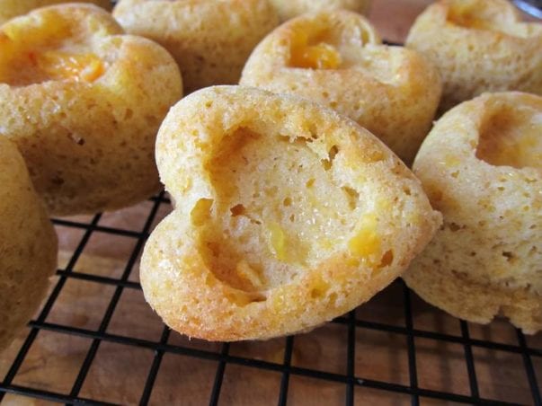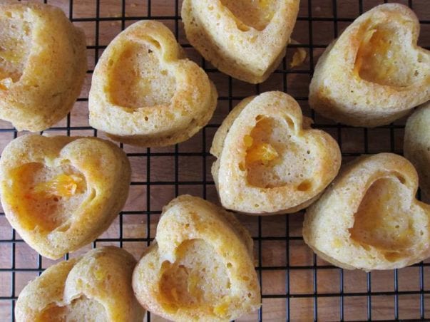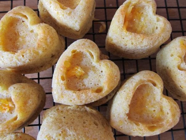 For a kid-friendly makeover of a recipe that originally featured butter and sugar prominently (and deliciously, no doubt), I pulled out my usual tricks: reduced the sugar and butter then added wheatgerm and pureed white beans. There were also two pans involved. One mini muffin size and the other heart-shaped which are closer to regular size muffins. For the larger size, which was bound for a toddler and not a baby who hasn’t had citrus yet, we added a syrupy glaze on top made out of freshly squeezed orange juice and a teaspoon of sugar, another healthier interpretation of the original idea.