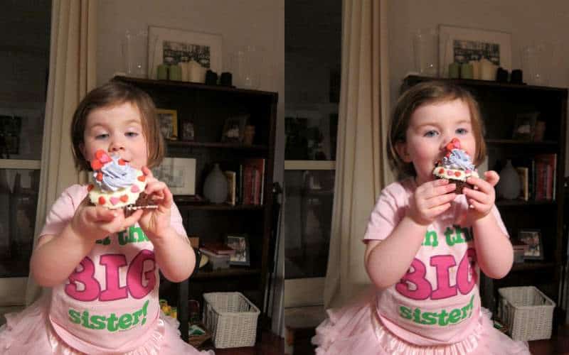 YOU DON’T EAT THEM EVERY DAY so why mess with a good thing? Because in our house we’re dealing with babies. And toddlers. And neither one is a pretty sight in the company of too much sugar. Actually, Estelle hasn’t really had sugar yet and Phoebe talks a good game but after a few bites she usually gives up–and we’ve got half a regular-sugar cupcake in the fridge to prove it.