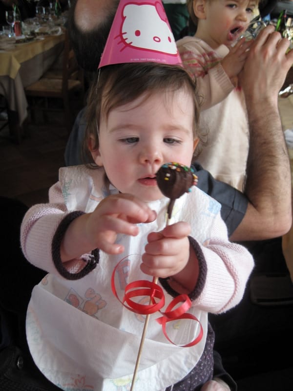 SHE’S ALREADY ONE! And to celebrate Estelle’s first big day with friends, we made cake pops. But not just any cake pops. These started with a healthier version of David Lebovitz’s amazing banana cake, in honor of Estelle’s favorite fruit, then we dip, dip, dipped our way to chocolate covered bliss.