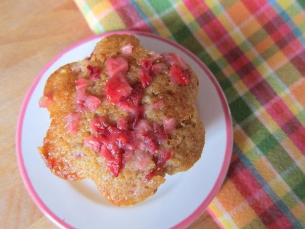 Heat oven to 375 degrees. Using a large bowl, mix together flour, wheat germ, sugar, baking soda, and salt. In a separate bowl, stir together oil, applesauce, buttermilk, vanilla, and eggs. Add dry ingredients in two steps, stirring until just incorporated. Add vinegar, and mix thoroughly. Fold in ½ cup strawberries. Lightly grease a muffin pan. Fill three-quarters full and bake until golden brown, about 15 minutes. (Press your finger tip onto the top of the muffins, if they spring back, they’re done.)