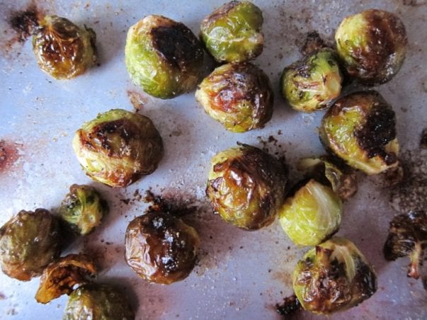 Making roasted Brussels sprouts couldn’t be easier. You peel the outermost leaves and trim the ends. Then put them on a baking sheet, drizzle extra virgin olive oil, sprinkle salt and pepper then roll everything around until each one is coated in salty goodness. Pop into a hot oven preheated to 400 degrees, and roast for about 35 minutes. Sprinkle with a little more salt when they come out…and serve.