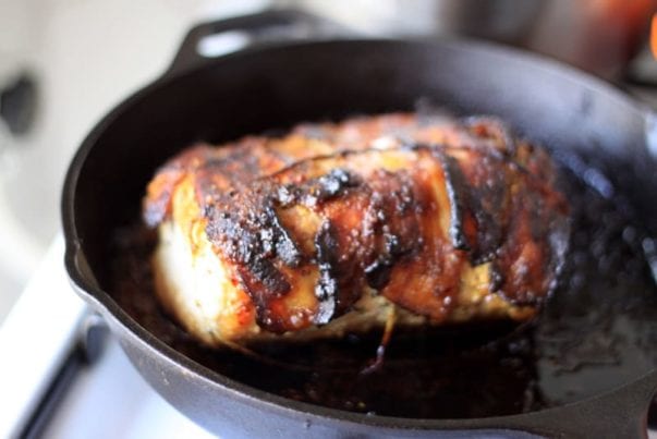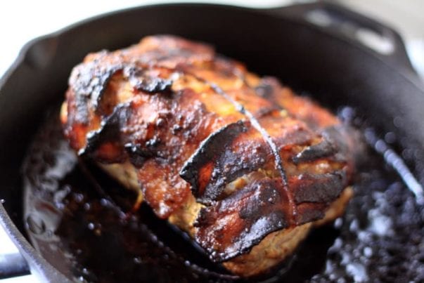 The first step is to create a honey mustard sauce and slather it all over the pork. Next, wrap bacon around the roast until one side (the top) is totally covered; secure with twine. I tied it horizontally because I thought it’d keep more bacon in place. (It did.) The original recipe, Honey Mustard Pork Roast with Bacon, doesn’t require searing but I always think it’s a good idea for tasty meat, especially when that meat is bacon.