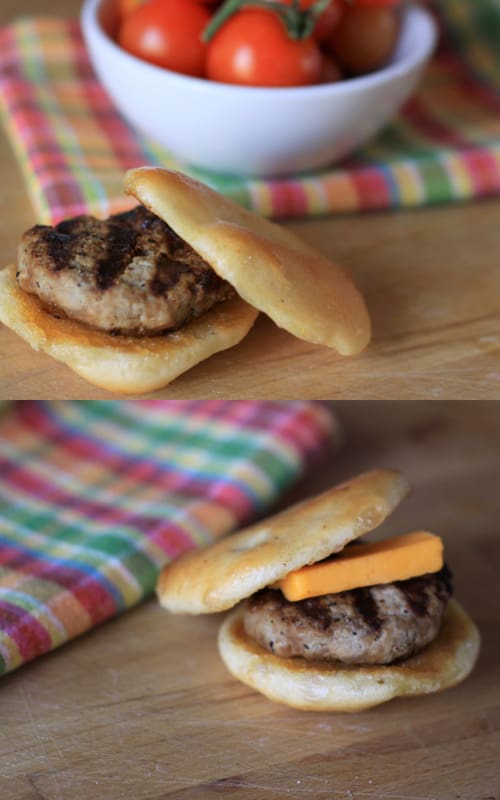 First, I made everything miniature. She talks a good game but Phoebe has never eaten a full size burger and I hate be a waster. So I split the size of a regular patty in two. Our “buns” are really an Italian snack called pizza bianca, which is a lot like focaccia bread, and more importantly, something they both love. You could use any small buns.
