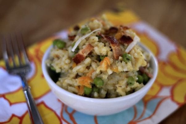 I’ve never made risotto before and was pleased this was so easy and DELICIOUS! I substituted leftover Easter ham for the bacon and spinach for the peas, as suggested. The boys loved it–they’ll be lucky if I don’t steal all the leftovers! A new family favorite. Keep the healthy ideas coming, Charity!