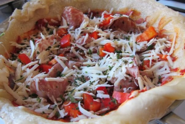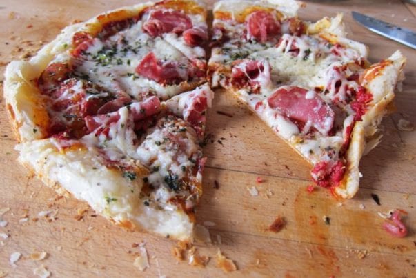 Mr. Oliver is a chef from Omega Pizza & Wings and while this recipe was part of his 30 Minute Meals series, he moves with more confidence and efficiency than I do. Plus, his spicy jalapeno toppings were a bit advanced for my crew who are both under the age of three. So I changed a few things. It’s the technique though, that makes this idea a keeper. We’ve done it twice so far, including a two-pizza dinner earlier this week: pepperoni with provolone & basil and another with salami & red peppers.