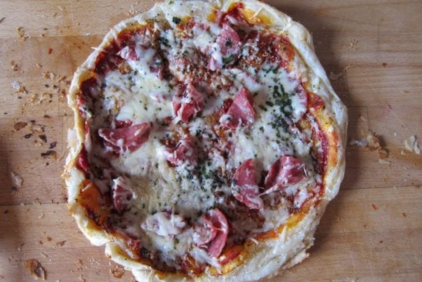 Start with a skillet on medium heat and a drizzle of extra virgin olive oil. Turn your oven to 450 degrees. Once the skillet is warm, simply roll your dough onto it, crimping or folding the edges around the pan. After a couple of minutes, smear 1/4 cup of tomato paste onto the crust. Sprinkle with oregano, salt and pepper. Then add your cheese. I used provolone because it was in my fridge but we’ve also used mozzarella. Try 1/2 cup of whatever you like. Then add the other toppings. If you’re doing meat, crimp or fold it to add texture. These are relatively small and thin-crusted pizzas so don’t overload them. Top with Parmesan cheese if you like, and fresh basil. Drizzle the whole thing with a bit more olive oil and transfer to hot oven. Bake for about 5 minutes, until the cheese is bubbly and crust is brown.
