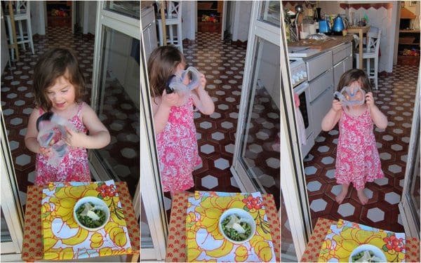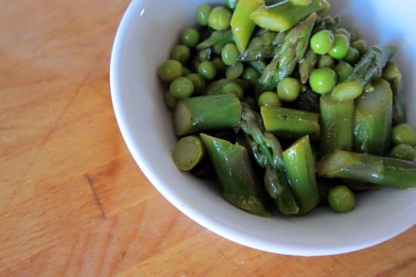 Our dinner table is divided these days: there is one pea fan, one asparagus fan. This dish combines the best of both, in an effort to help them both try a bit of something previously rejected (and rejected and…) plus they’re just a delicious combination for those of us who enjoy everything.